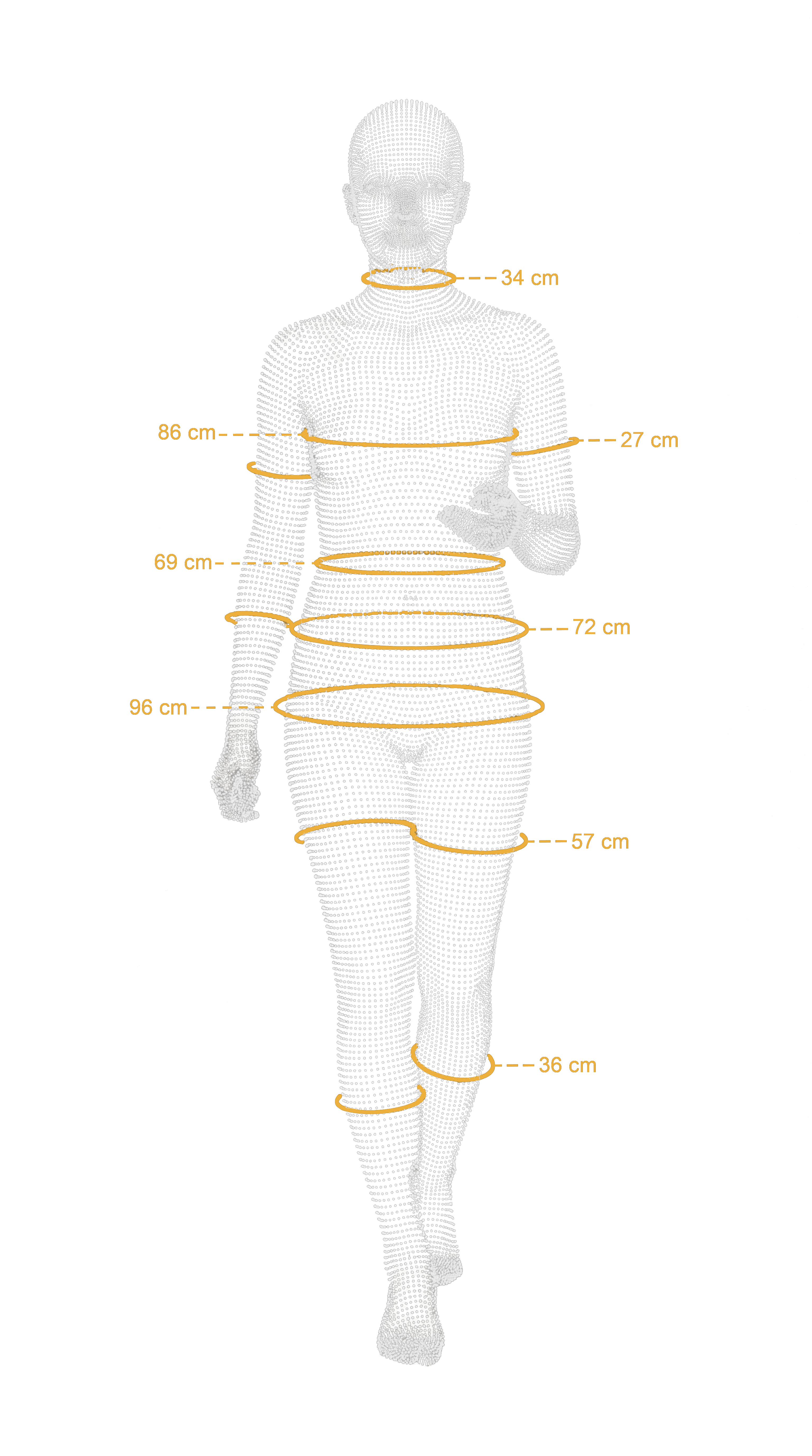 Our scanner integrates three synchronized Time-of-Flight (ToF) sensors, enabling the capture of a full-body scan of a fully clothed user in just a few seconds. Our patented AI accurately infers each user’s unique body shape. It is the only solution on the market that enables a fully clothed, privacy-first body scan, removing the need for undressing or manual measurements. Our landmark point engine automatically extracts more than 220 standardized body measurements, ensuring consistent, accurate, and reliable results across all users. This standardized framework allows us to deliver precisely the measurements required by retailers and manufacturers, regardless of brand or product category. The entire process is fully autonomous, fast, and secure, delivering reliable sizing data without manual intervention or privacy concerns.